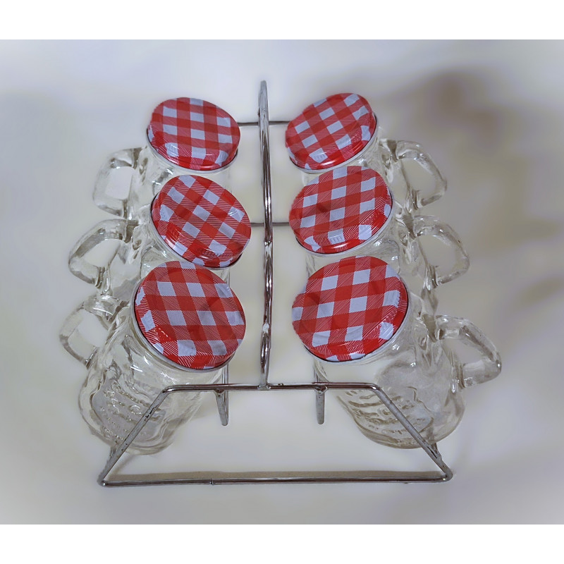 Apportez une touche rétro et pratique à votre cuisine avec cet ensemble de 6 pots à épices en verre gravé présentés sur leur support métallique. Chaque pot est muni d’une poignée et d’un couvercle à motif vichy rouge et blanc, pour un style à la fois charmant et vintage. Idéal pour conserver vos épices, thé, sucre, sel, herbes aromatiques..., tout en ajoutant une note décorative à votre cuisine.