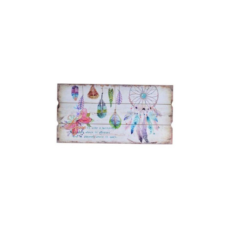 Invitez la douceur et la sérénité dans votre intérieur avec ce tableau en bois décoratif au motif attrape-rêves et plumes colorées. Ses teintes pastel et son effet vieilli apportent un style bohème chic et une ambiance apaisante