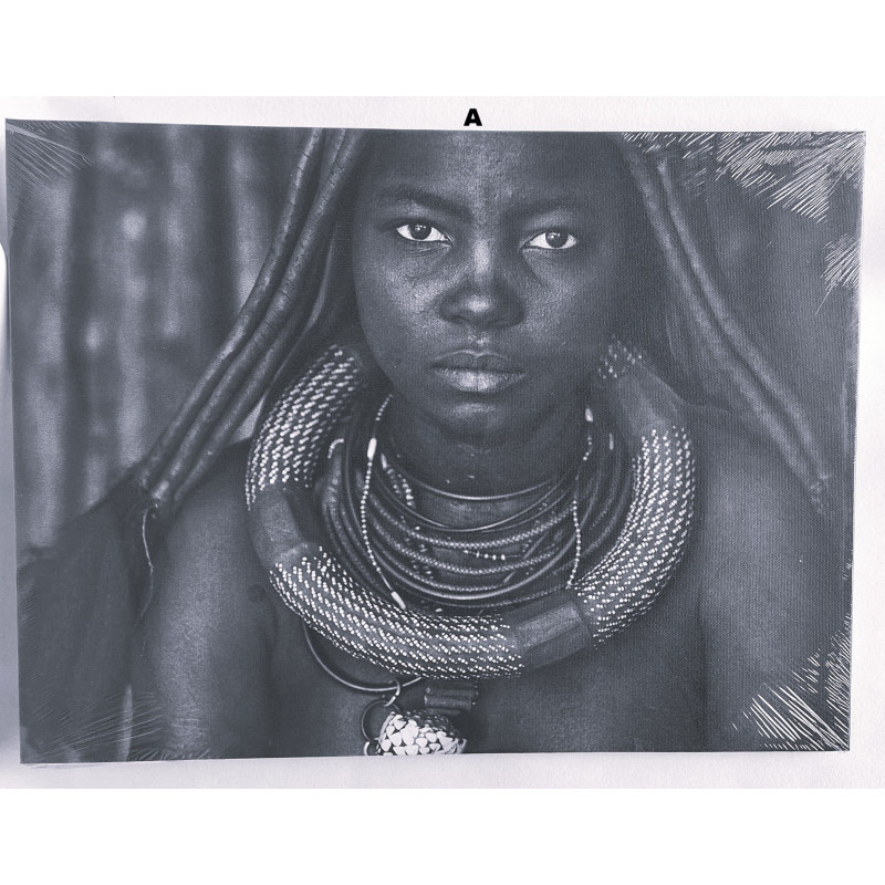 Superbes tableaux imprimés sur toile représentant des portraits africains en noir et blanc, au style photographique très expressif. Chaque toile est montée sur un châssis en bois, prête à être accrochée. Ces portraits apportent une touche ethnique, artistique et moderne idéale pour décorer un salon, couloir, bureau ou chambre. 4 modèles au choix (A, B, C ou D)