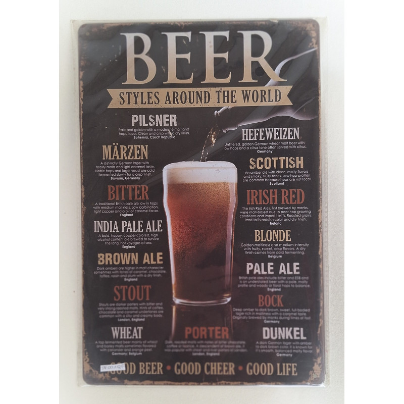 Décorez votre intérieur avec cette plaque murale en métal au style vintage, présentant différents types de bières reconnus dans le monde. Parfaite pour apporter une touche chaleureuse et conviviale dans une cuisine, une salle à manger, un bar, un cellier ou une cave aménagée.