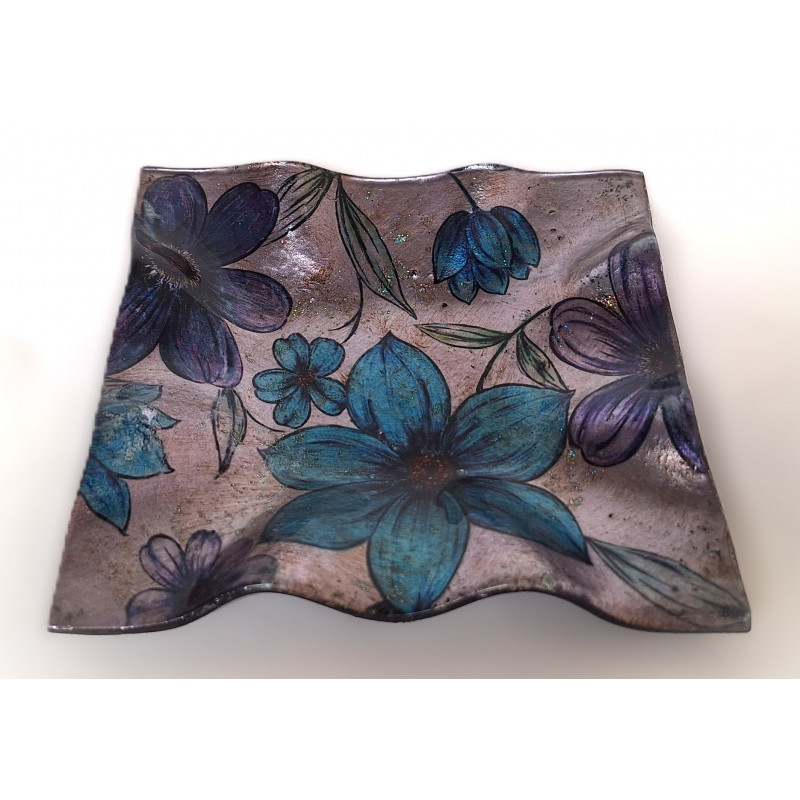 Apportez une touche d’élégance et de fraîcheur à votre décoration avec ce centre de table carré ondulé en verre, orné d’un motif floral raffiné dans des tons bleus et violets. Son design légèrement ondulé capte la lumière et met en valeur les reflets du verre, créant un effet visuel à la fois doux et lumineux.