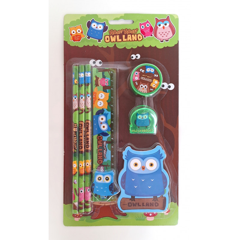 Ajoutez une touche de fantaisie à la rentrée avec ce charmant set papeterie sur le thème des hiboux ! Chaque kit comprend 8 pièces : 3 crayons de bois décorés, 1 règle, 1 taille-crayon, 1 gomme, 1 bloc-notes hibou et 1 pince. 4 couleurs au choix