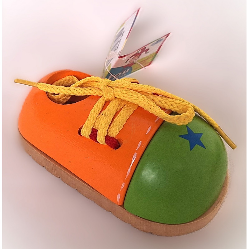 Jeu éducatif en bois : J’apprends à lacer mes chaussures. Un jouet idéal pour développer la motricité fine, la coordination et l’autonomie des enfants. Les lacets sont de vrais lacets, permettant un apprentissage réaliste et progressif. 3 couleurs au choix