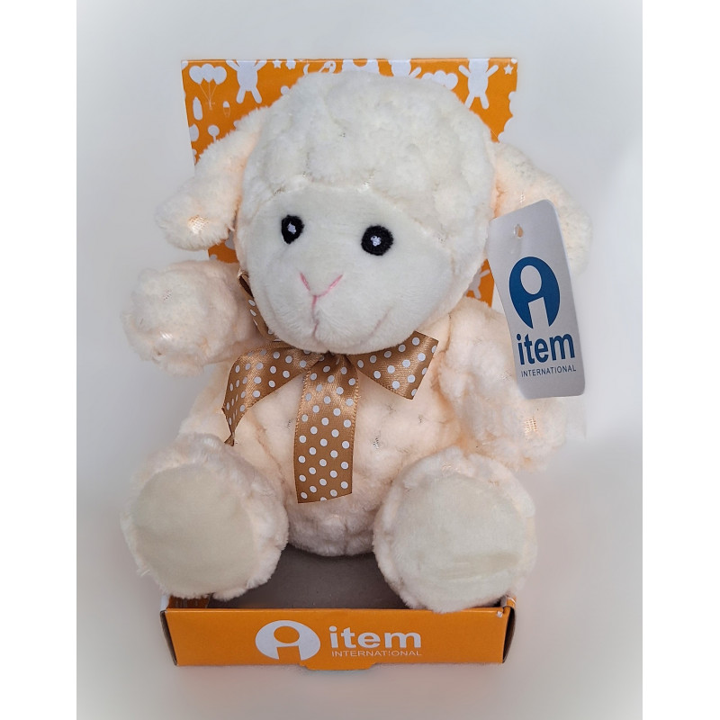 Adorable peluche mouton blanc assis, au toucher très doux, parfaite pour les câlins ou pour décorer une chambre d’enfant. Son ruban à pois apporte une petite touche charmante et rétro.